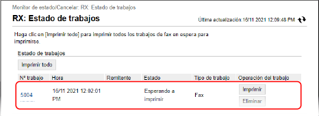 Al hacer clic en el número de trabajo, aparece la pantalla [Detalles del trabajo]. Puede ver la hora de recepción y el número de páginas y obtener una vista previa del fax.