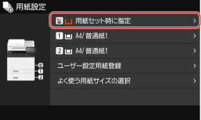 操作パネルの[ホーム]画面で、[用紙設定]を押す