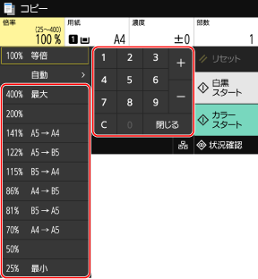一覧から定形変倍の倍率を選択するか、テンキーで任意の倍率を入力して[閉じる]を押します。