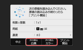 1 | 原稿台ガラスに次の原稿をセットし、[次の読込 白黒]または[次の読込 カラー]を押す 次の原稿がスキャンされ、同じ画面が表示されます。 すべての原稿のスキャンが完了するまで、この操作を繰り返します。 原稿ごとにカラーモード(白黒/カラー)を選択できます。次の原稿を白黒でコピーする場合は[次の読込 白黒]を、カラーでコピーする場合は[次の読込 カラー]を押します。 [濃度]/[原稿の種類]/[カラー調整]を押して、原稿ごとに設定を変更することもできます。 原稿ごとのサイズが異なる場合は、画像が欠けたり、用紙に対して画像が小さくプリントされたりすることがあります。 |