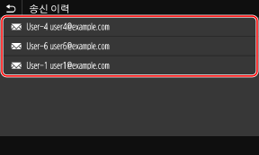 스캔 또는 팩스 화면의 [수신인 지정] 탭에서 [송신 이력]를 누릅니다.
