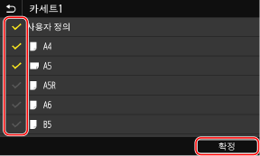 확인란 선택이 취소된 용지 크기는 용지 설정 화면에 표시되지 않습니다.