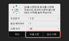 원고대 위에 원고를 놓고 스캔한 경우 추가 원고를 스캔하기 위한 화면이 표시됩니다.