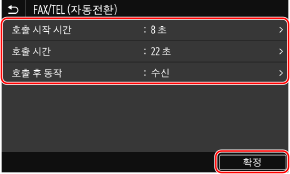 수신 호출이 팩스인지 여부를 확인할 수 있도록 [FAX/TEL (자동전환)]을 활성화한 경우에는 벨 울림 시간 같은 설정도 구성할 수 있습니다.
