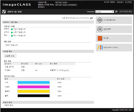 리모트 UI에 로그인하면 포털 페이지(리모트 UI 상위 페이지)가 나타납니다. 여기서 기기의 작동 상태를 확인하고, 다양한 정보를 보고, 단추 조작으로 설정을 변경할 수 있습니다.