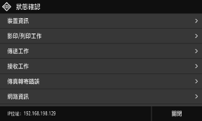 在 [首頁] 畫面和其他位置按下 [狀態確認] 時會顯示此畫面。此畫面可用來檢查本機資訊、使用情況和記錄、網路設定和錯誤資訊。