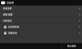 在 [首頁] 畫面中按下 [功能表] 時會顯示此畫面。此畫面可用來指定本機的各種設定。