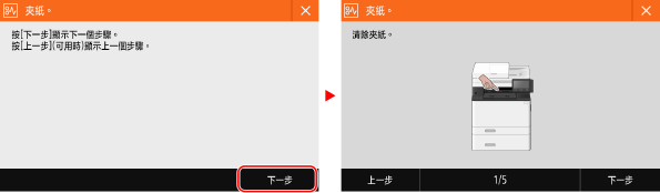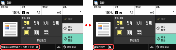 發生錯誤而且本機的紙張或碳粉匣中的碳粉用完時,畫面會顯示訊息。