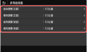 您可以為各個紙張來源和列印面(正面和背面)指定調整方向和寬度。