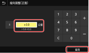 透過選擇在紙張上向下調整的正值或在紙張上向上調整的負值來指定調整寬度。