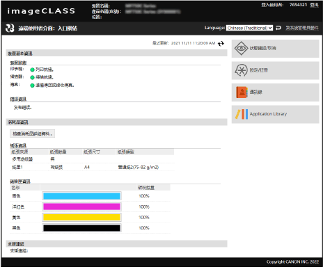 您登入到遠端使用者介面時,入口網站頁面(遠端使用者介面首頁)會出現。您可以從其中檢查本機的操作狀態、檢視各種資訊,以及藉由按鈕操作變更設定。