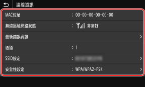 使用 [狀態確認] 畫面檢視資訊您也可以透過下列程序檢視無線區域網路狀態和錯誤資訊: 在操作面板的 [首頁] 或其他位置  [狀態確認]  [網路資訊]  [網路連線類型]。 |