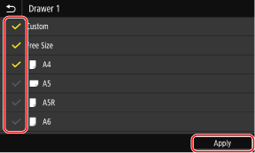 Paper sizes whose checkboxes are cleared are not displayed on the paper settings screen.