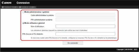 Sélectionnez [Mode administrateur système] ou [Mode utilisateur général], puis saisissez les éléments requis en fonction du paramétrage utilisé.