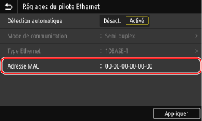 Vous pouvez visualiser l’adresse MAC définie pour la machine lorsque celle-ci est connectée au réseau local câblé.