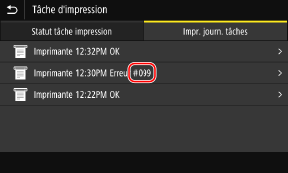 Si l’impression ne peut pas être effectuée, si un I-Fax ne peut pas être reçu, ou si une autre erreur se produit, un code d’erreur (un nombre à trois chiffres commençant par « # ») s’affiche dans le journal des tâches.