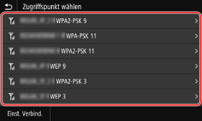 Suchen Sie nach einem WLAN-Router (Zugangspunkt), mit dem Sie eine Verbindung herstellen möchten, und geben Sie den Netzwerkschlüssel ein. Wenn Sie eine Verbindung mit der Zugangspunkt-Einrichtungsmethode herstellen, werden die folgenden Authentifizierungs- und Verschlüsselungsmethoden festgelegt: WEP-Authentifizierungsmethode: Offenes System Verschlüsselung für WPA/WPA2: AES-CCMP oder TKIP wird automatisch entsprechend dem ausgewählten WLAN-Router festgelegt. Um eine andere Authentifizierungs- oder Verschlüsselungsmethode festzulegen, verwenden Sie die manuelle Einrichtungsmethode für die Verbindung. Verbinden mit einem drahtlosen LAN durch Einstellen der Details (manuelle Einrichtungsmethode) |