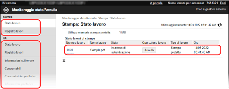 Da Monitoraggio stato/Annulla nella IU remota, è possibile verificare lo stato e i registri di una funzione, lo stato operativo della macchina e le informazioni di errore.