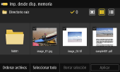 Inserte el dispositivo de memoria USB en la máquina, y en la pantalla [Inicio], pulse [Imp. desde disp. de mem.] para mostrar los archivos y carpetas del dispositivo de memoria USB.