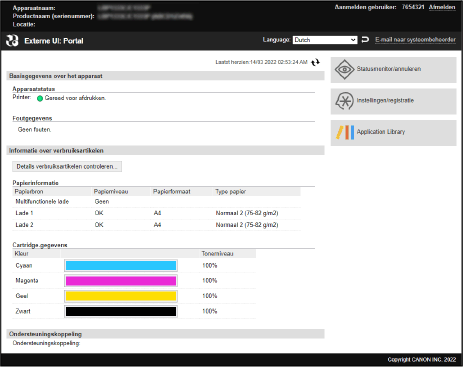 Als u inlogt bij Externe UI, verschijnt de Portal-pagina (bovenste pagina, Externe UI). Hier kunt u de bedieningsstatus van het apparaat controleren, verschillende soorten informatie bekijken, en instellingen wijzigen met knopbedieningen.