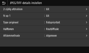 Om het scherm weer te geven, drukt u op [JPEG/TIFF-det. inst.] op het scherm Inst. Geheugenmedia Afdrukken.