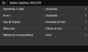 Use este ecrã para configurar definições de impressão detalhadas para ficheiros JPEG e TIFF, como ajustar a qualidade da imagem.