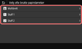 Skjermbildet for papirinnstillinger viser registrerte, ofte brukte papirformat. Hvis ubrukte papirformat vises, kan du skjule disse for hver papirkilde slik at det blir lettere å velge papirformat.