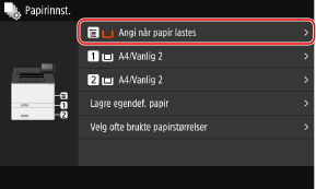 Når det er lagt papir i flerfunksjonsskuffen, vises skjermbildet for papirinnstilling på betjeningspanelet.