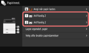 Som standard er papirformat og -type for papirskuffen stilt inn til A4 og Vanlig 2. Når papir med et annet format eller -type legges i, må du endre papirinnstillinger.