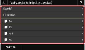 Trykk på [Andre str.] og velg papirformat fra listen som vises.