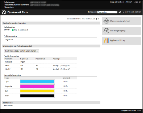 Når du logger inn på Fjernkontroll, vises portalsiden (fremsiden for Fjernkontroll). Herfra kan du sjekke brukstatus for maskinen, vise ulik informasjon og endre innstillingene ved bruk av knapper.