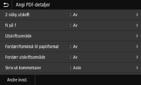 * For PDF-filer, kan du skrive ut 9 eller 16 sider av et dokument på én side av arket, ved å bruke [N på 1] på skjermbildet for detaljerte innstillinger. Skjermbildet [Angi PDF-detaljer]