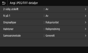Når du vil vise dette skjermbildet, trykker du på [Angi JPEG/TIFF-det.] på skjermbildet for innstillinger for minnemedia-utskrift.