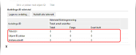 Du kan vise antall sider som er skrevet ut for hver Avdelings-ID når Administrere Avdelings-ID er aktivert.