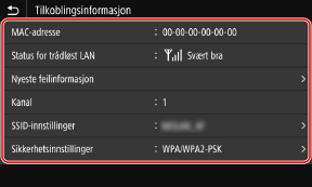 I tillegg til MAC-adressen og tilkoblingsinformasjon for trådløst LAN når maskinen er koblet til et trådløst LAN, kan du også vise sikkerhetsinnstillingene.