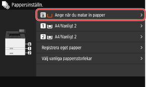 När papper fylls på i multiutmatningsfacket visas som standard skärmen för att ange pappersformat och papperstyp på kontrollpanelen.