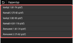 När papperet har fyllts på i multiutmatningsfacket visas skärmen för inställning av pappersformat och papperstyp på kontrollpanelen.