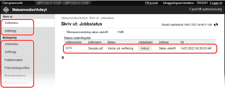 Från Statusmonitor/Avbryt i fjärranvändargränssnittet kan du kontrollera statusen och loggar för funktioner, enhetens åtgärdsstatus och felinformation.