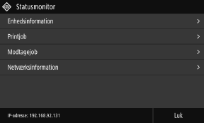 Denne skærm vises, når du trykker på [Statusmonitor] på skærmen [Hjem] og andre steder. Brug denne skærm til at kontrollere oplysninger for maskinen, brugen heraf, loggene, netværksindstillinger og fejloplysninger. Skærmen [Statusmonitor]