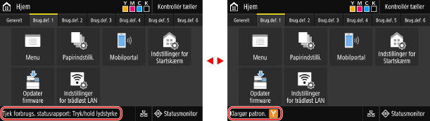 Denne skærm vises, når du trykker på [] på betjeningspanelet. Som standard vises skærmen [Hjem], efter at strømmen er blevet tændt og umiddelbart efter, at startskærmen lukkes, og umiddelbart efter, at du har logget dig ind. Skærmen [Hjem]