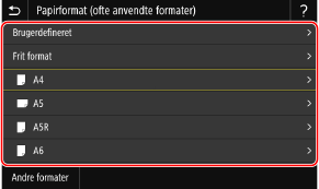 Tryk på [Andre formater], og vælg papirstørrelsen fra den viste liste.