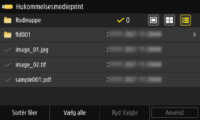 Skærmen for valg af filer på USB-hukommelsesenhed