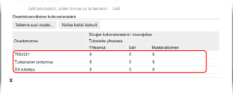 Voit tarkastella kullakin osastotunnuksella tulostettujen sivujen määrää, kun osastotunnusten hallinta on käytössä.