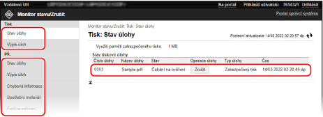 V nabídce Monitor stavu/Zrušit ve vzdáleném uživatelském rozhraní můžete zkontrolovat stav a protokoly funkce, provozní stav zařízení a informace o chybách.