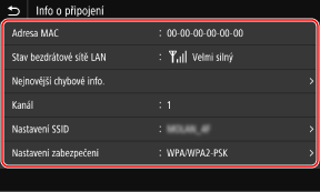 Když je zařízení připojeno k bezdrátové síti LAN, můžete kromě MAC adresy a informací o připojení k bezdrátové síti LAN také zobrazit nastavení zabezpečení.