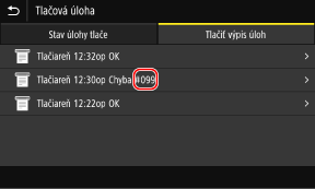 Ak nie je možné vykonať tlač, prijať I-fax alebo sa vyskytne iná chyba, vo výpise úloh sa zobrazí chybový kód (trojmiestne číslo začínajúce „#“).