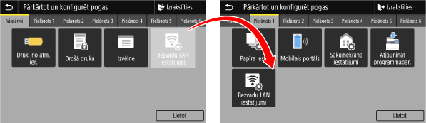 Pogas ekrānā [Sākums] var pārkārtot un pogas var pārvietot uz citām cilnēm.