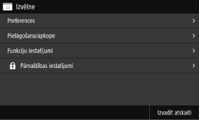 ]. Pēc noklusējuma ekrāns [Sākums] tiek parādīts pēc iekārtas ieslēgšanas un uzreiz pēc sākšanas ekrāna aizvēršanas, un uzreiz pēc pieteikšanās. Ekrāns [Sākums]