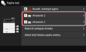 Pēc noklusējuma papīra formāts un papīra atvilktnes tips tiek iestatīts kā A4 un Parasts 2. Ja ievietotā papīra formāts vai veids atšķiras, mainiet papīra iestatījumus.
