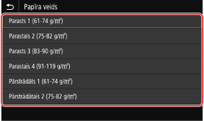 Ja jums ir bieži jāmaina ievietojamais papīrs, izmantojiet opciju [Brīvs] — tādējādi katrā iekārtas lietošanas reizē varēsit mainīt iestatījumu, veicot mazāku skaitu darbību. Tomēr ņemiet vērā, ka šis iestatījums ļauj iekārtai veikt drukāšanu, pat ja printera draivera papīra veida iestatījums neatbilst iekārtā ievietotajam papīra veidam.